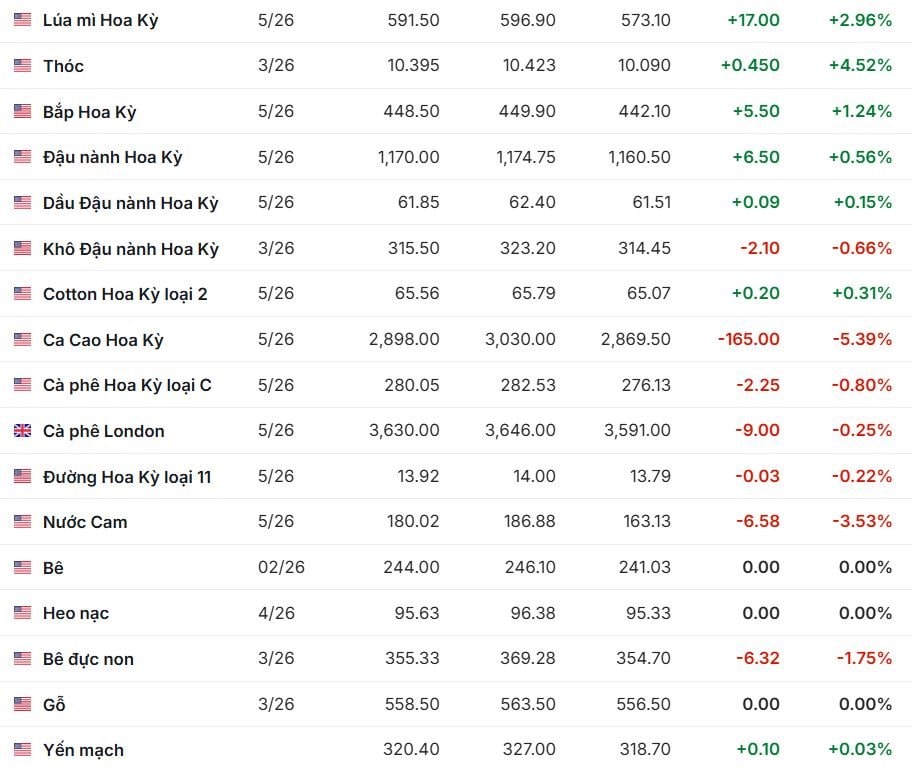 Trên sàn London, Robusta giảm gần 2%. Hợp đồng tháng 3/2026 ở mức 3.689 USD/tấn, tháng 5/2026 là 3.639 USD/tấn, tháng 7/2026 là 3.569 USD/tấn, tháng 9/2026 là 3.511 USD/tấn và tháng 11/2026 là 3.446 USD/tấn.