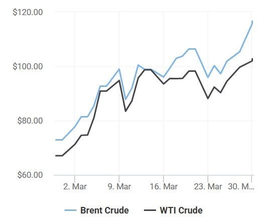 Trong phiên giao dịch, dầu Brent kỳ hạn đạt 115,66 USD/thùng, còn WTI đạt 102,56 USD/thùng. Đà tăng được thúc đẩy bởi việc xung đột lan rộng sang Biển Đỏ và các điểm nghẽn vận tải quan trọng như eo biển Bab el-Mandeb.