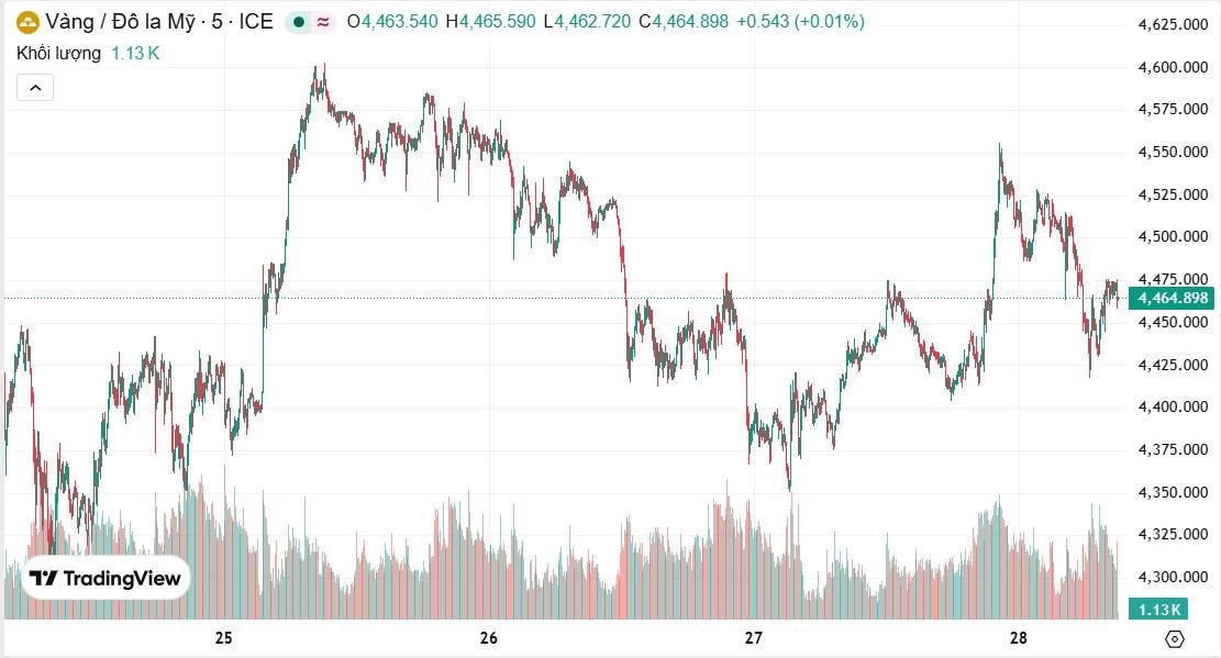 Trái ngược với xu hướng thông thường, giá vàng lại giảm 1,0% xuống 4.445 USD/ounce. Trong phiên sáng tại châu Á, giá vàng giao ngay ở mức 4.472 USD/ounce, giảm 21 USD so với cuối tuần trước.