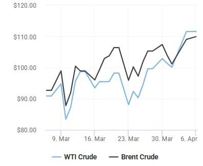 Giá dầu WTI vượt giá Brent, đều trên 110 USD/thùng