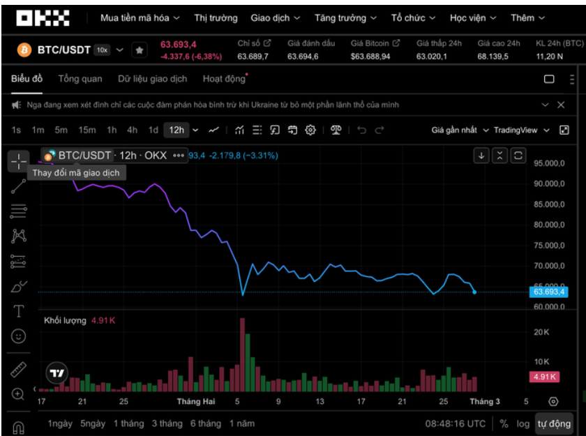 Dữ liệu từ sàn OKX cho thấy Bitcoin (BTC) đang giảm hơn 6%, xuống vùng 63.000 USD.