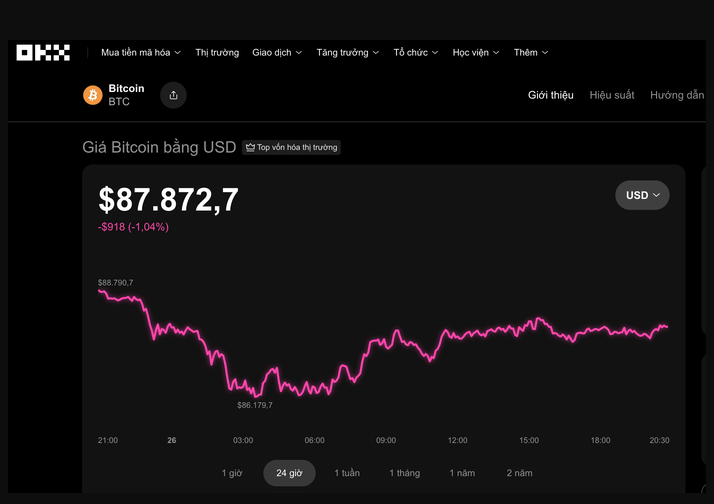 Tối 26-1, thị trường tiền số tiếp tục chìm trong sắc đỏ. Dữ liệu từ sàn OKX cho thấy trong 24 giờ qua, Bitcoin giảm 1%, lùi về mức 87.872 USD.