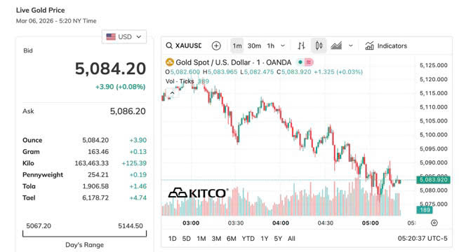 Tính đến 10 giờ 30 phút sáng 6/3 (giờ Việt Nam), giá vàng thế giới giảm nhẹ 5,8 USD/ounce so kết phiên hôm trước xuống mức 5.134,4 USD/ounce. Theo dữ liệu từ biểu đồ giá vàng của Kitco, vào khoảng 17 giờ 20 phút ngày 6/3 giờ Việt Nam (5 giờ 20 phút sáng 6/3 giờ New York), giá vàng giao ngay trên thị trường quốc tế ở mức khoảng 5.084,2 USD/ounce.