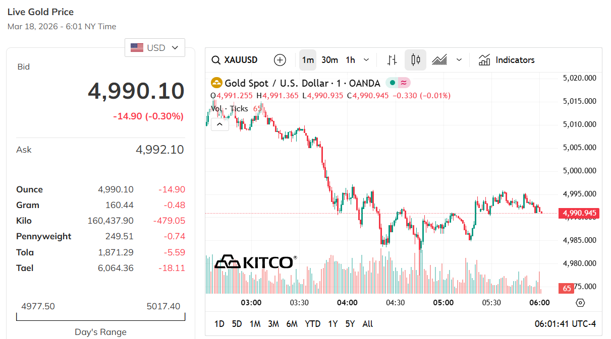 Lúc 6 giờ sáng 18/3 giờ New York (17 giờ Việt Nam), theo dữ liệu trên Kitco, giá vàng giao ngay ở mức khoảng 4.990,1 USD/ounce, giảm 14,9 USD, tương đương 0,30% so với phiên trước.