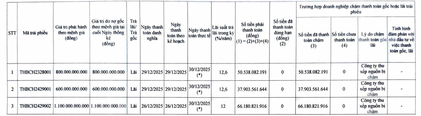 Theo đó, ngày 30/12/2025, Thiên Hà - Băng Dương đã thanh toán tổng cộng khoảng 155 tỷ đồng tiền lãi cho 3 lô trái phiếu THBCH2328001, THBCH2429001 và THBCH2429002. Lý do chậm thanh toán gốc lãi là vì công ty thu xếp nguồn bị chậm.