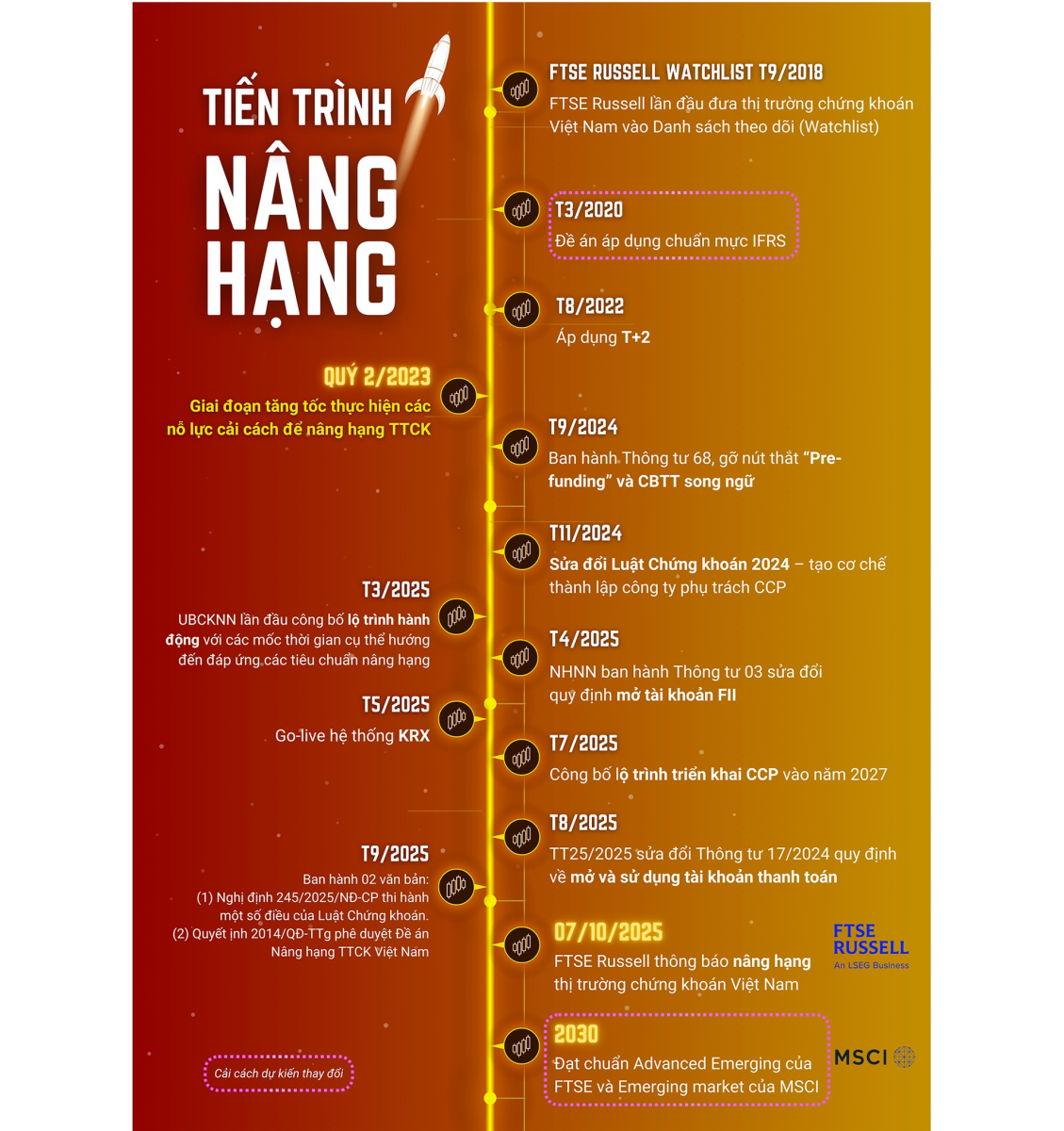 Từ dấu mốc này, nỗ lực của cơ quan quản lý được đẩy mạnh rõ rệt. Bộ Tài chính và UBCKNN liên tục tổ chức các buổi làm việc với với FTSE Russell, MSCI và nhiều tổ chức quốc tế để hiểu rõ các tiêu chí đánh giá, từ đó đưa ra giải pháp phù hợp với thực tiễn thị trường Việt Nam.