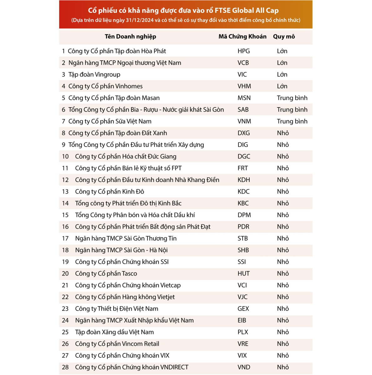Các tổ chức quốc tế đưa ra dự báo khá đồng thuận về quy mô dòng vốn có thể chảy vào Việt Nam sau nâng hạng. Ngân hàng Thế giới (WB) ước tính "cú hích" nâng hạng có thể mang lại tới 25 tỷ USD vốn đầu tư quốc tế đến năm 2030. VinaCapital cho rằng việc được FTSE nâng hạng có thể giúp thu hút thêm 5–6 tỷ USD. Trong khi đó, HSBC đánh giá trong kịch bản thuận lợi, tổng dòng vốn bao gồm cả quỹ chủ động có thể lên đến hơn 10 tỷ USD. Dòng vốn khổng lồ hàng tỷ USD không chỉ là tiền mà sẽ là bước đệm giúp gia tăng thanh khoản thị trường và tái định giá giá trị của doanh nghiệp.