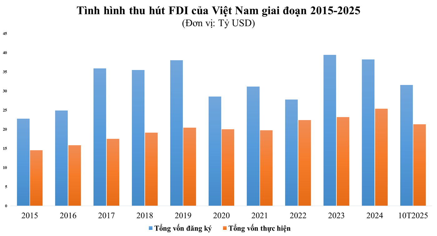 Trong 10 tháng đầu năm 2025, Việt Nam đã thu hút 31,52 tỷ USD vốn FDI đăng ký, tăng 15,6% so với cùng kỳ năm trước; giải ngân đạt 21,3 tỷ USD, mức cao nhất trong 5 năm, tập trung lớn nhất trong lĩnh vực chế biến, chế tạo.