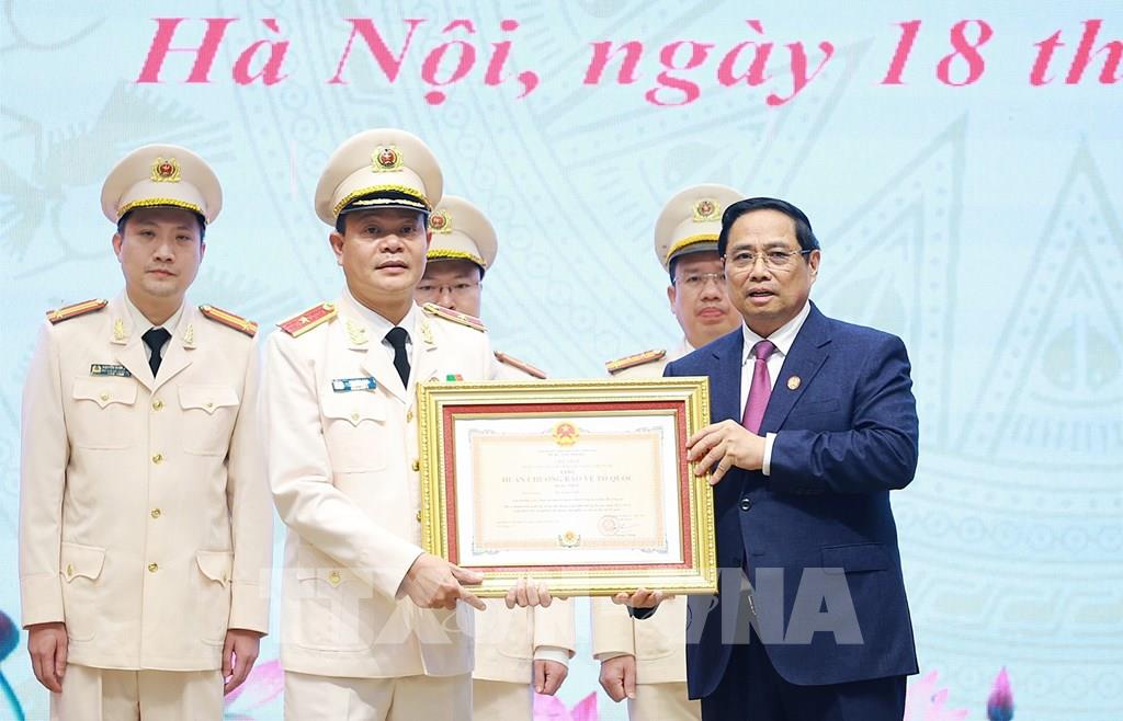 Thủ tướng Phạm Minh Chính trao huân chương Bảo vệ Tổ quốc hạng Nhất cho Thiếu tướng Vũ Văn Tấn, Cục trưởng Cục Cảnh sát Quản lý hành chính về trật tự xã hội đã có thành tích xuất sắc trong công tác cải cách hành chính giai đoạn 2021 – 2025 và trong triển khai Đề án 06 giai đoạn 2022-2025. Ảnh: Dương Giang-TTXVN