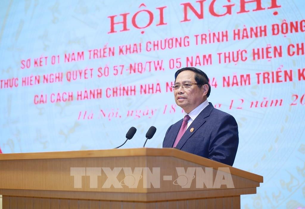 Thủ tướng Phạm Minh Chính phát biểu tại Hội nghị sơ kết triển khai Nghị quyết số 57-NQ/TW về đột phá phát triển khoa học, công nghệ, đổi mới sáng tạo và chuyển đổi số. Ảnh: Dương Giang-TTXVN
