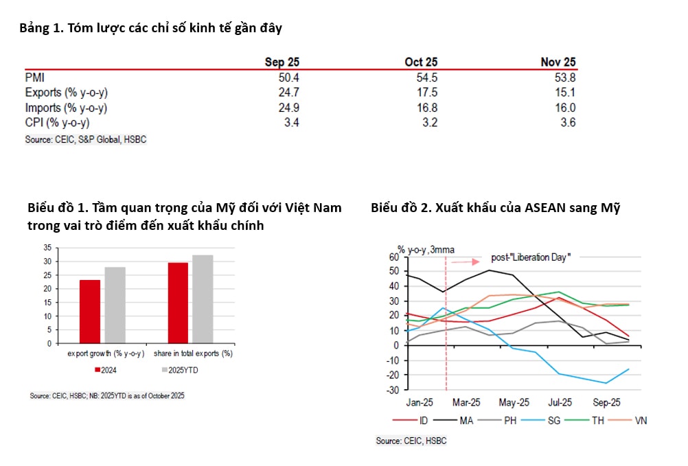Câu chuyện về thuế quan vẫn chưa vãn hồi. Trong báo cáo mới nhất, các chuyên gia của HSBC cho rằng chúng ta đang chờ đợi kết quả các cuộc đàm phán cuối cùng, chẳng hạn đàm phán về thuế trung chuyển 40% và thuế quan theo ngành đối với bán dẫn - cả hai đều quan trọng đối với thương mại và tăng trưởng của Việt Nam. Mặc dù khó có thể thấy rõ tình hình thương mại, nhưng các chỉ số chính như PMI tháng 11 đã vẽ nên một bức tranh lạc quan hơn khi bước sang năm 2026, với các đơn đặt hàng xuất khẩu mới tiếp tục mở rộng với tốc độ nhanh hơn.