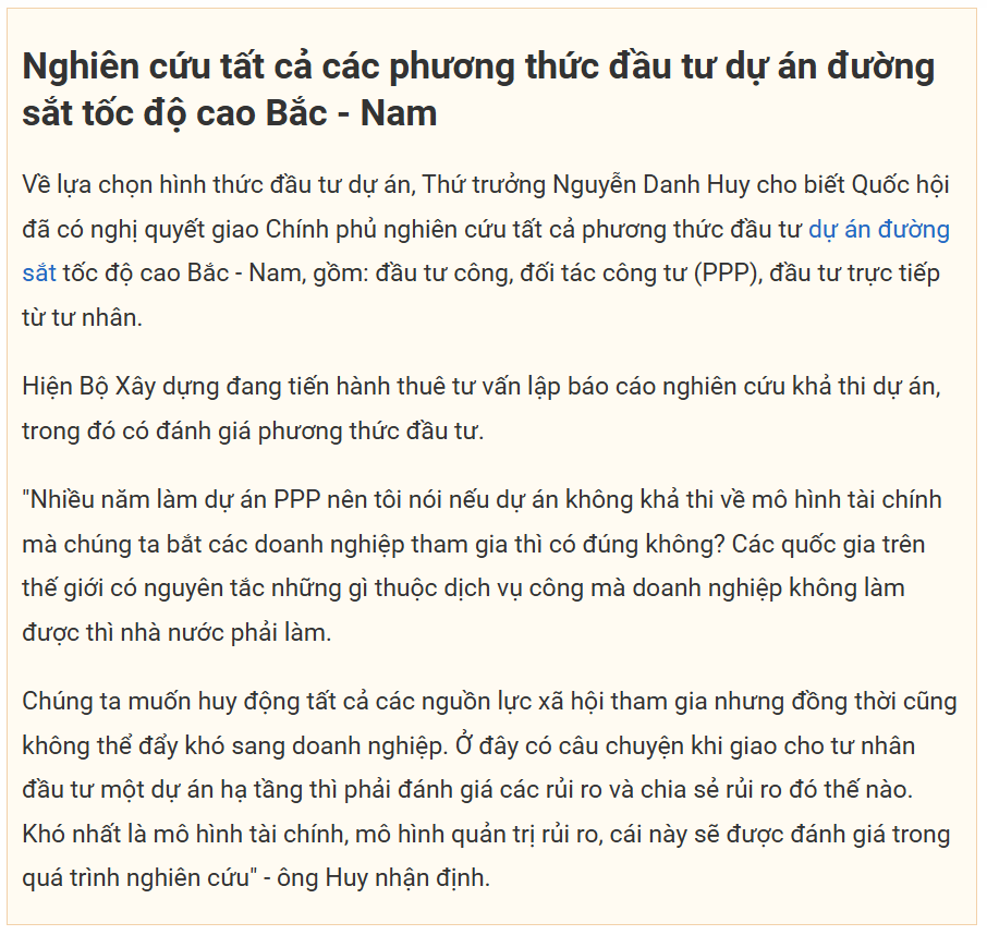 Theo Thứ trưởng Nguyễn Danh Huy, để đánh giá được hiệu quả của dự án đường sắt tốc độ cao Bắc - Nam cũng như giải pháp kỹ thuật, công nghệ theo quy định pháp luật và thực tiễn thì cần phải đến bước báo cáo nghiên cứu khả thi dự án. Lúc đó mới có đủ số liệu để trả lời về tổng mức đầu tư, hiệu quả, mô hình đầu tư. Bước tiền khả thi hiện tại không đủ số liệu để đánh giá hiệu quả tài chính của dự án.