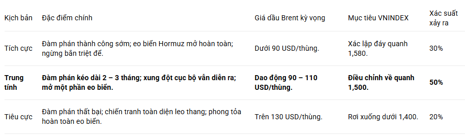 Ba kịch bản VN-Index: Tích cực: Brent < 90 USD/thùng, VN-Index ~1,580 (xác suất 30%). Trung tính: Brent 90–110 USD/thùng, VN-Index ~1,500 (xác suất 50%). Tiêu cực: Brent > 130 USD/thùng, VN-Index < 1,400 (xác suất 20%).