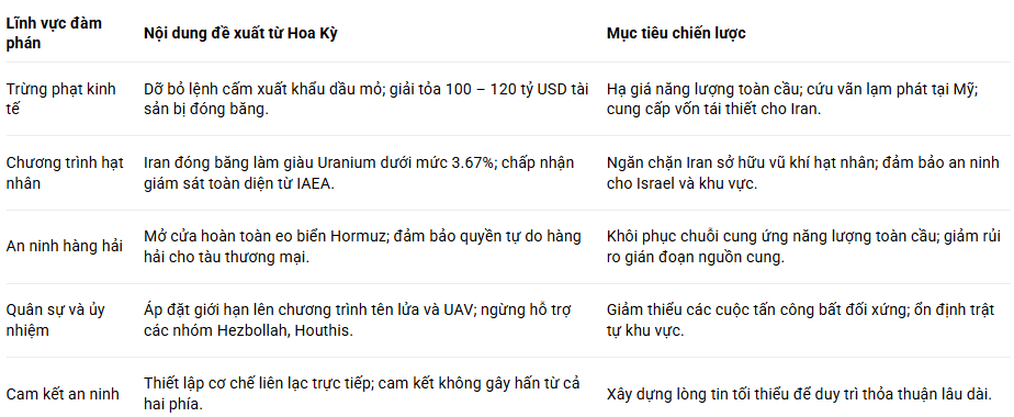 Trọng tâm của vòng đàm phán tại Islamabad là một kế hoạch hòa bình gồm 15 điểm do chính quyền Trump soạn thảo và chuyển giao cho Iran thông qua các trung gian Pakistan và Ai Cập. Theo các nguồn tin ngoại giao được KBSV tổng hợp, kế hoạch này được thiết kế như một “thỏa thuận toàn diện” nhằm giải quyết đồng thời các vấn đề từ hạt nhân, tên lửa đạn đạo đến an ninh hàng hải. Mặc dù Iran đã công khai bác bỏ kế hoạch này như một nỗ lực “tin giả” nhằm thao túng thị trường tài chính, các chi tiết rò rỉ cho thấy một cấu trúc đánh đổi rất cụ thể giữa lợi ích kinh tế và các giới hạn quân sự.