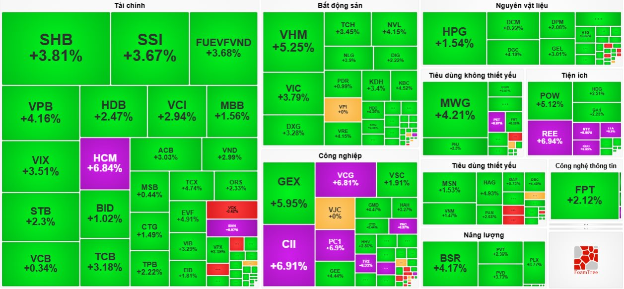 Bên cạnh đó, loạt cổ phiếu vốn hóa lớn tại các nhóm ngành khác cũng tăng bứt phá, đóng góp vào đà tăng chung của thị trường, như: BVH +6,97%, REE +6,94%, BSR +4,17%, PLX +3,77%, HAG +4,93%, MWG +4,21%, FPT +2,12%, POW +5,12%, DGC +4,19%, HPG +1,54%, …