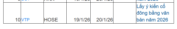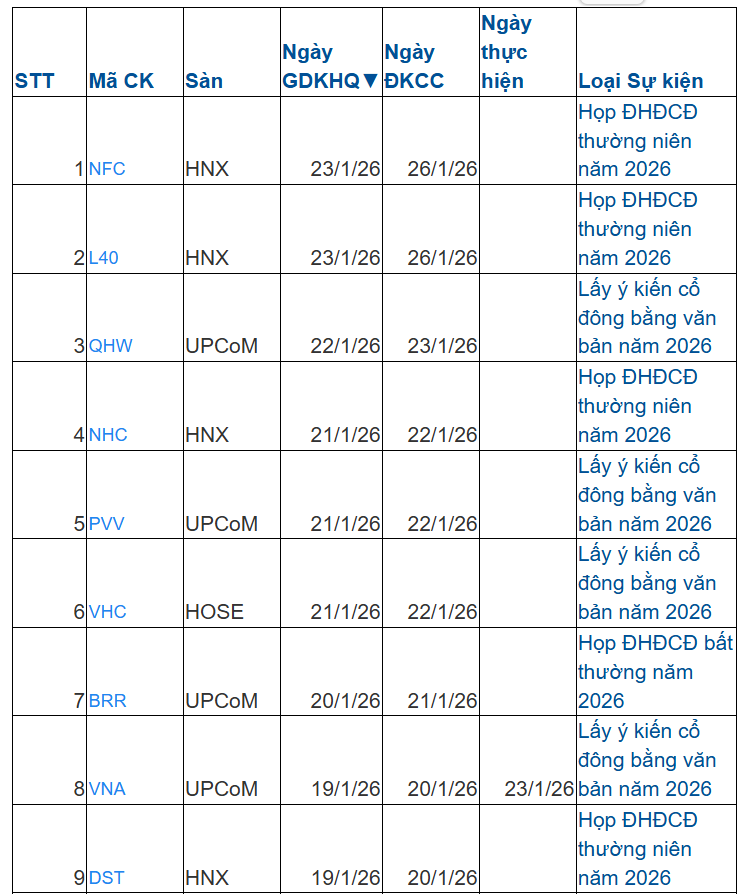Trong tuần tới từ ngày 19-23/1, có 10 doanh nghiệp chốt quyền họp đại hội cổ đông; trong đó có 2 doanh nghiệp trên HoSE; 4 doanh nghiệp trên HNX và 4 doanh nghiệp trên UPCoM.