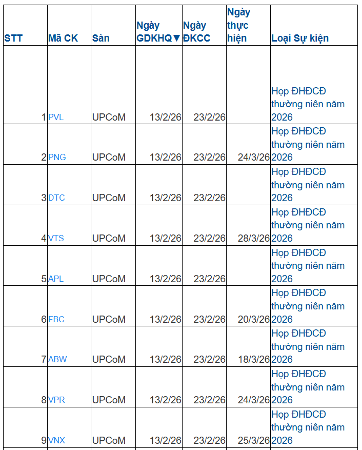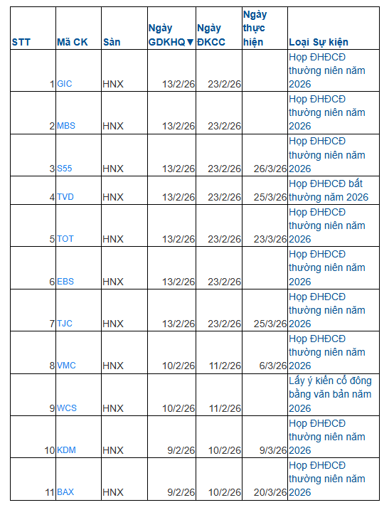 Trong tuần tới từ ngày 9-13/2, có 30 doanh nghiệp chốt quyền họp đại hội cổ đông; trong đó có 5 doanh nghiệp trên HoSE; 11 doanh nghiệp trên HNX và 14 doanh nghiệp trên UPCoM.
