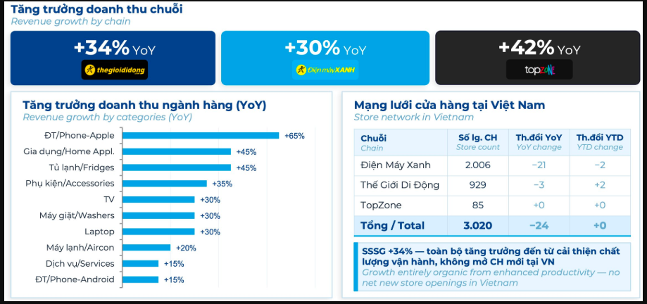 Xét theo từng chuỗi, Topzone là mảng có tăng trưởng cao nhất 42%; tiếp đến là chuỗi Thế Giới Di Động tăng 34% và nhóm Điện Máy Xanh có doanh thu cao hơn 30% so với cùng kỳ năm ngoái. Về ngành hàng, điện thoại tăng mạnh 65%, sau đó là mảng gia dụng cũng như tủ lạnh tăng trưởng 45%.