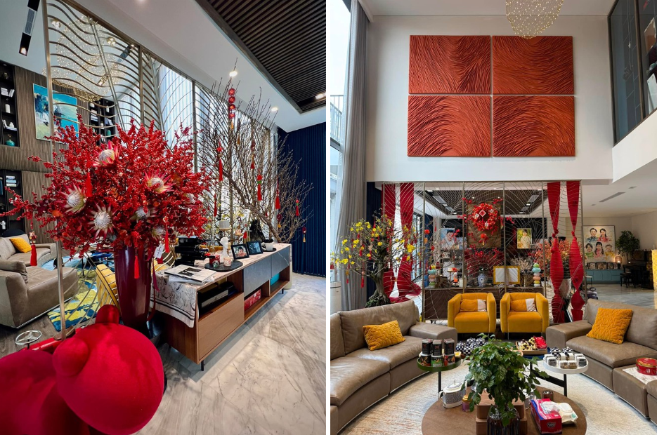 Căn biệt thự của vợ chồng Cường Đô La đã được trang hoàng đỏ rực đón Tết (ảnh: FBNV)