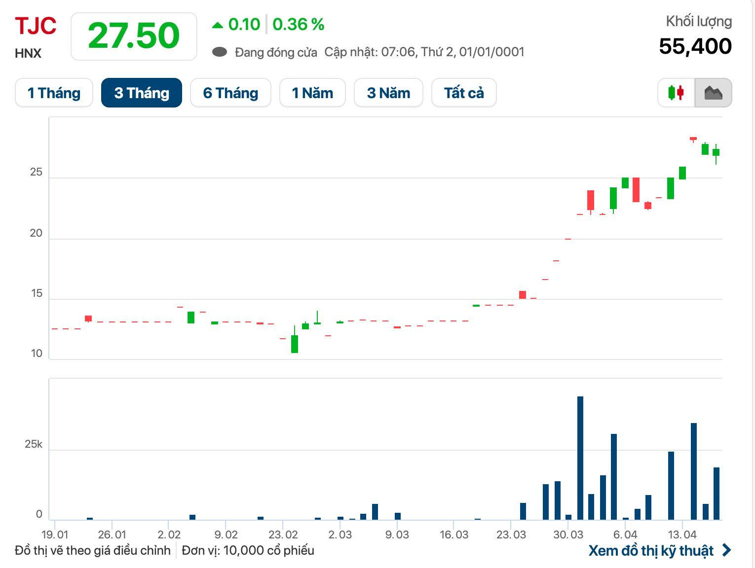 Trên thị trường chứng khoán, kết thúc phiên giao dịch ngày 17/4, cổ phiếu TJC tăng nhẹ 0,4%, lên mức 27.500 đồng/cổ phiếu.