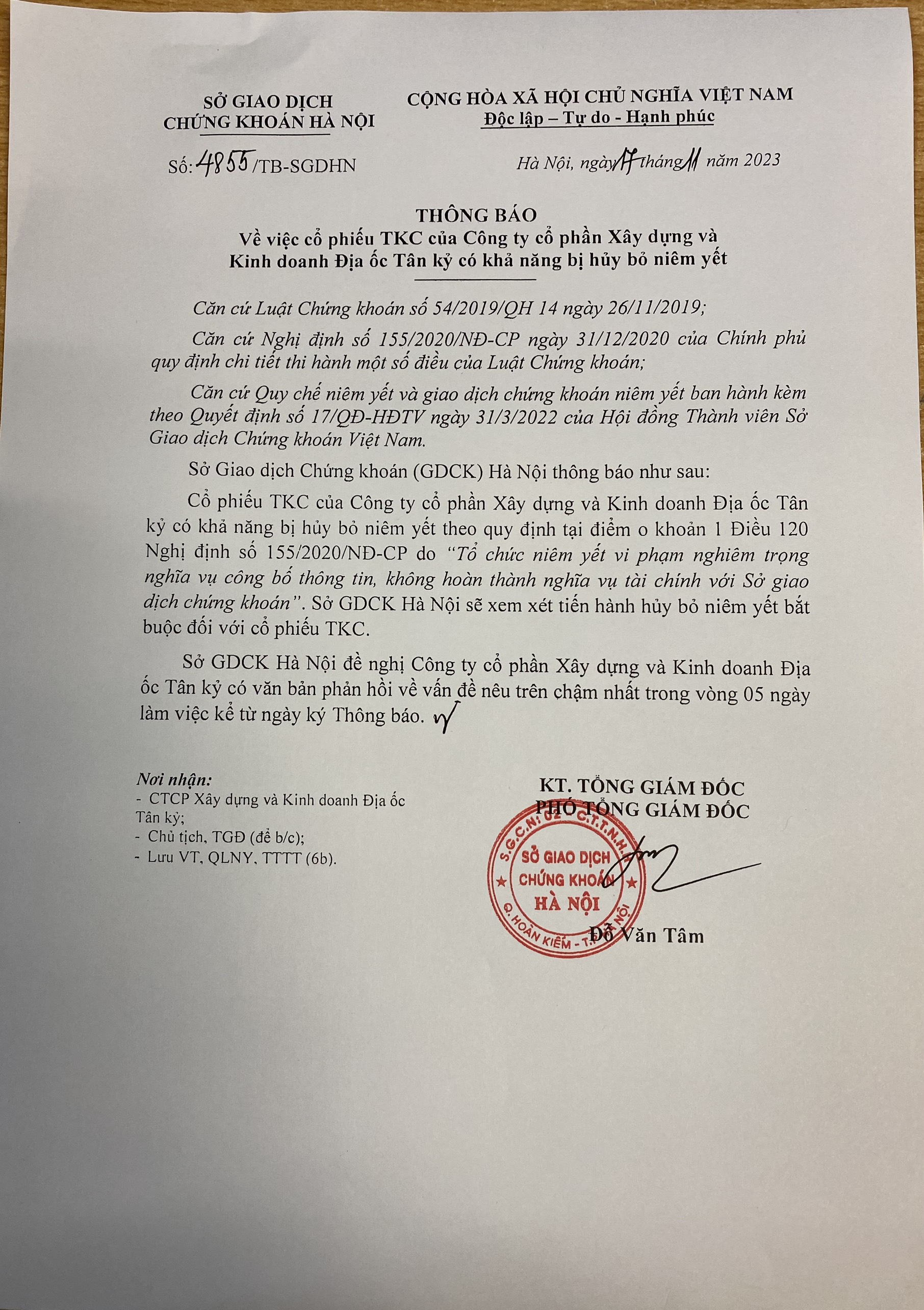 TKC: Thông báo về việc cổ phiếu TKC có khả năng bị hủy bỏ niêm yết