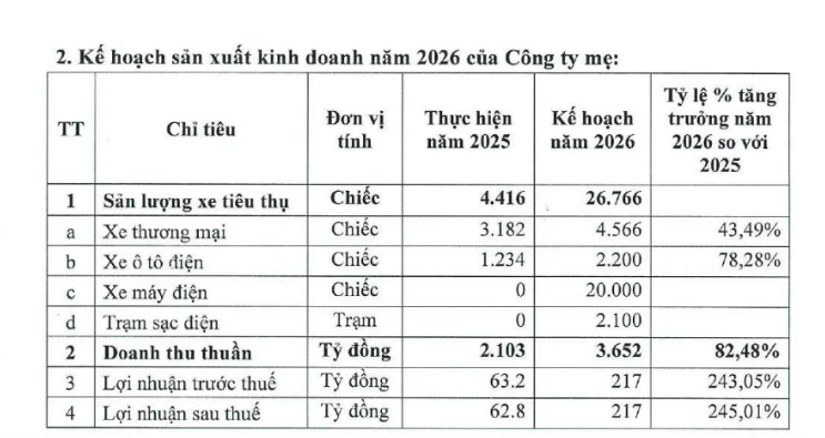 TMT Motors cũng đặt mục tiêu dạt doanh thu thuần 3,652 tỷ đồng, tăng 82,48% so với kế hoạch năm 2025. Lợi nhuận trước thuế và lợi nhuận sau thuế lần lượt tương ứng là 217 tỷ đồng, tương đương với mức tăng tương ứng so với năm 2025 là 243,05% và 245,01%.