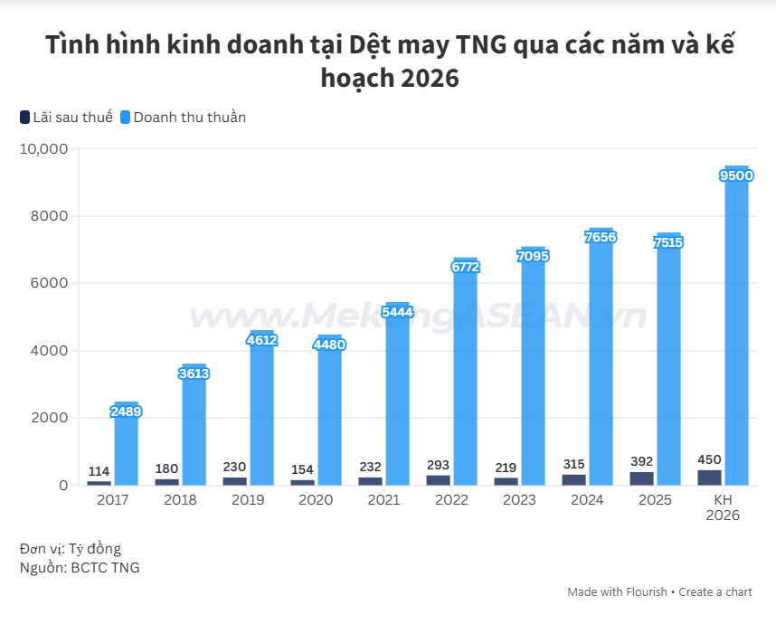Trên cơ sở đó, HĐQT Dệt may TNG trình cổ đông thông qua kế hoạch kinh doanh năm 2026 với mục tiêu doanh thu đạt 9.500 tỷ đồng, tăng 26% và lợi nhuận sau thuế đạt 450 tỷ đồng, tăng 15% so với cùng kỳ năm 2025 - mức doanh thu và lợi nhuận cao nhất từ trước đến nay tại doanh nghiệp.