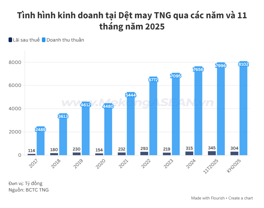 Lũy kế 11 tháng năm 2025, doanh thu tại TNG ước đạt 7.996 tỷ đồng, tăng gần 11% so với cùng kỳ năm trước, trong khi lãi sau thuế đạt 345,7 tỷ đồng, tăng hơn 17% YoY.