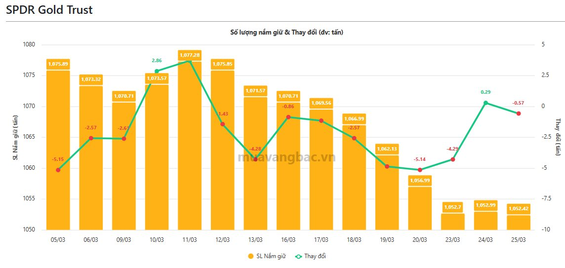 Theo cập nhật từ Muavangbac.vn, quỹ vàng lớn nhất thế giới SPDR Gold Trust trở lại trạng thái bán ròng khi gần 6 tạ vàng “rời kho” trong ngày 25/3. Trước đó, quỹ này đã bán ròng 25 tấn vàng trong chuỗi xả hàng liên tiếp từ phiên 12/3-23/3. Hiện tại, SPDR còn nắm hơn 1.052 tấn vàng.