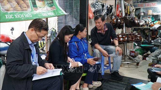Các điều tra viên lấy thông tin tại một hộ kinh doanh trên đường Trưng Nữ Vương (phường Hòa Cường, thành phố Đà Nẵng). Ảnh: Quốc Dũng/TTXVN