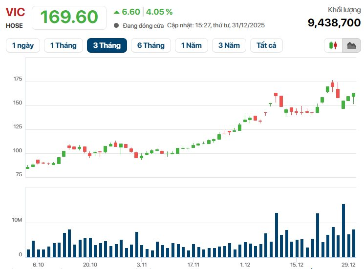 Kết phiên giao dịch cuối cùng của năm 2025, cổ phiếu họ nhà Vin đã đóng cửa với tất cả các cổ phiếu đều tăng trưởng tích cực.