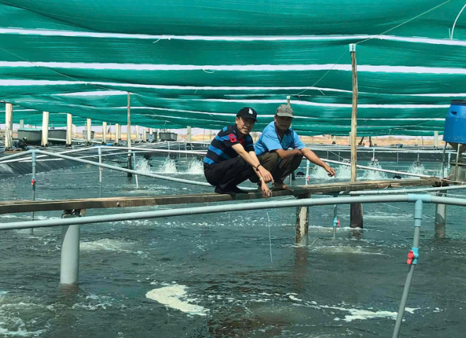 Ông Mai Văn Hoàng - người sáng lập Tập đoàn GrowMax (áo kẻ sọc) thăm và trò chuyện với một hộ nuôi tôm tại Cà Mau. Ảnh: HT.