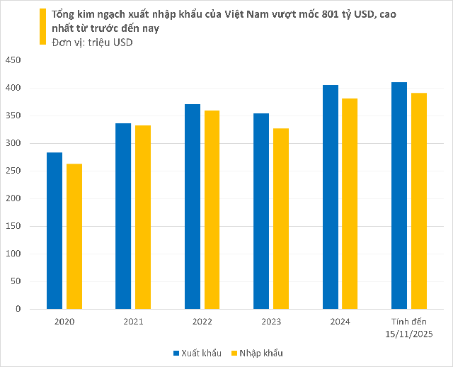 Việt Nam đã chính thức lọt nhóm 15 quốc gia có kim ngạch thương mại lớn nhất thế giới, sau khi tổng kim ngạch xuất nhập khẩu vượt mốc 801 tỷ USD tính đến ngày 15/11/2025. Đây là mức cao nhất từ trước đến nay và thậm chí vượt qua dự báo 800 tỷ USD mà Bộ Công Thương đưa ra hồi tháng 9. Chỉ trong nửa đầu tháng 11, thương mại hai chiều đã đạt 38,35 tỷ USD – tín hiệu cho thấy khả năng duy trì tăng trưởng mạnh mẽ của nền kinh tế trong giai đoạn biến động toàn cầu.