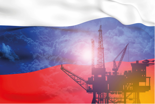 Hình minh họa dàn khoan dầu mỏ trên nền cờ Nga. Ảnh: GT Review