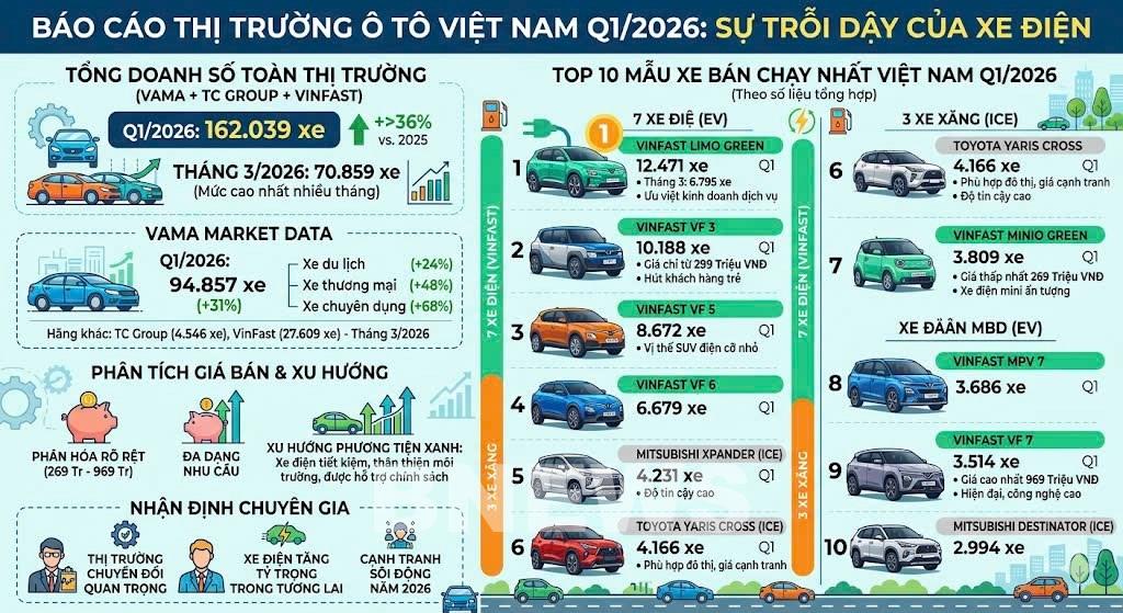 Các chuyên gia trong ngành nhận định, kết quả của Top 10 mẫu xe bán chạy nhất quý I/2026 là dấu hiệu rõ ràng cho thấy thị trường ô tô Việt Nam đang bước vào giai đoạn chuyển đổi quan trọng. Nếu xu hướng này tiếp tục được duy trì, xe điện nhiều khả năng sẽ chiếm tỷ trọng lớn hơn trong tổng doanh số toàn thị trường trong thời gian tới.