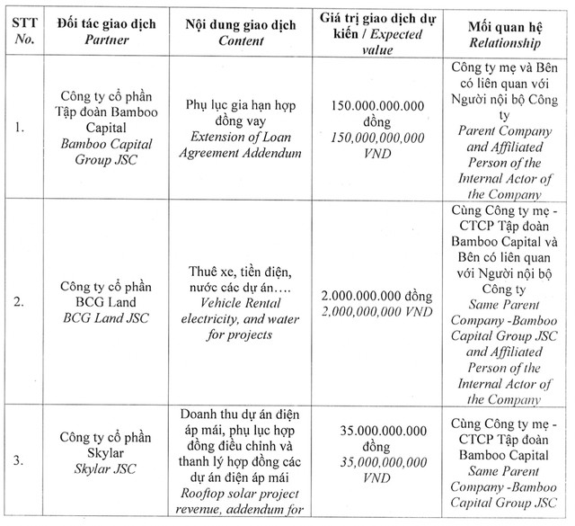 Cụ thể, Tracodi dự kiến gia hạn hợp đồng vay với CTCP Tập đoàn Bamboo Capital, giá trị 150 tỷ đồng. Với CTCP BCG Land, doanh nghiệp sẽ thực hiện các giao dịch liên quan đến thuê xe, chi phí điện, nước phục vụ dự án với tổng giá trị khoảng 2 tỷ đồng. CTCP Skylar được phê duyệt các giao dịch phát sinh doanh thu từ dự án điện áp mái và phụ lục hợp đồng, tổng giá trị 35 tỷ đồng.