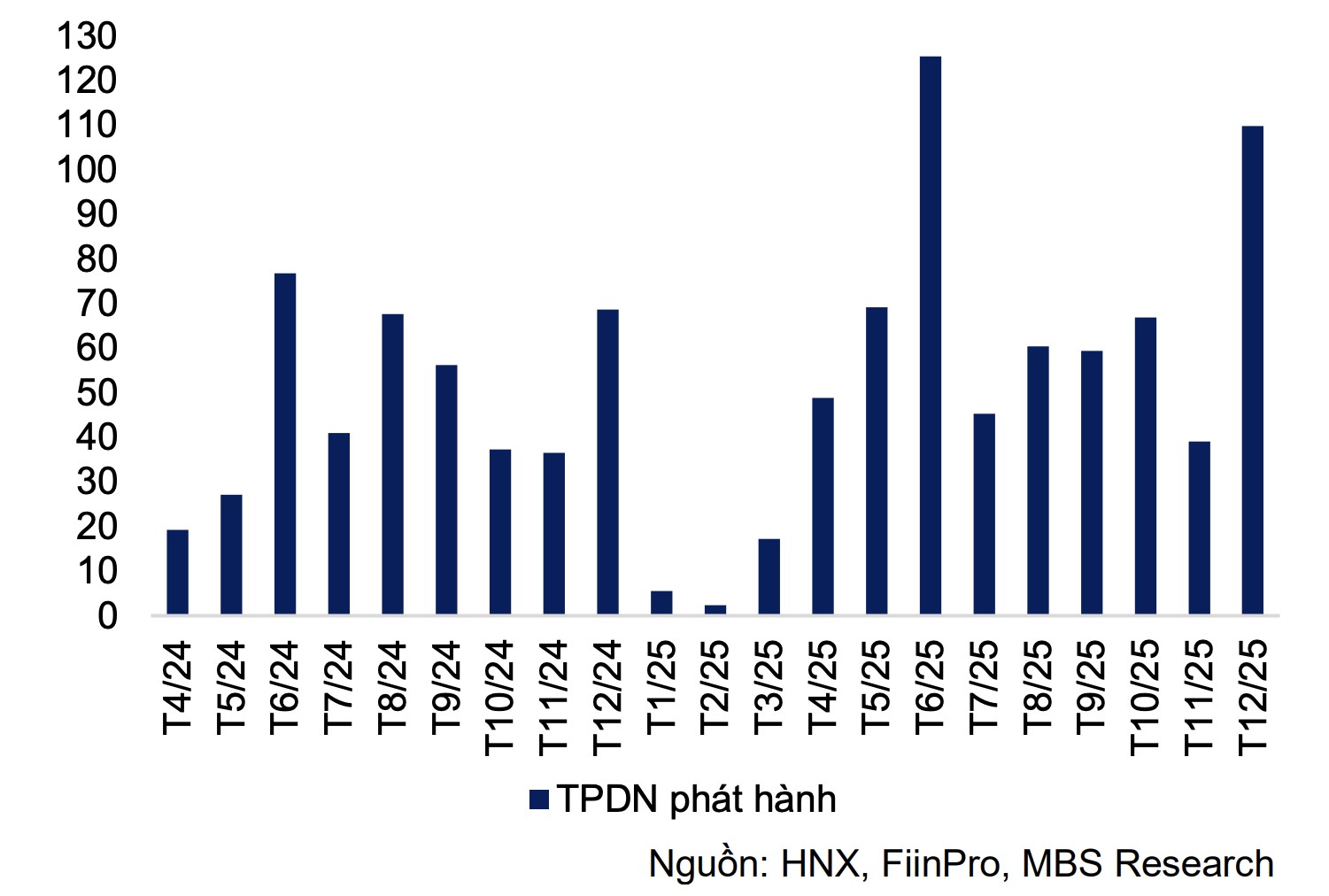 Theo Chứng khoán MB (MBS), sau tháng 11 có phần trầm lắng, thị trường trái phiếu doanh nghiệp (TPDN) tháng 12 ghi nhận sự sôi động trở lại với 99 đợt phát hành, tổng giá trị đạt 109.800 tỷ đồng (tăng 181,5% so với tháng 11 và 60% so với cùng kỳ năm trước - YoY), ghi nhận mức phát hành theo tháng cao thứ hai trong năm 2025.
