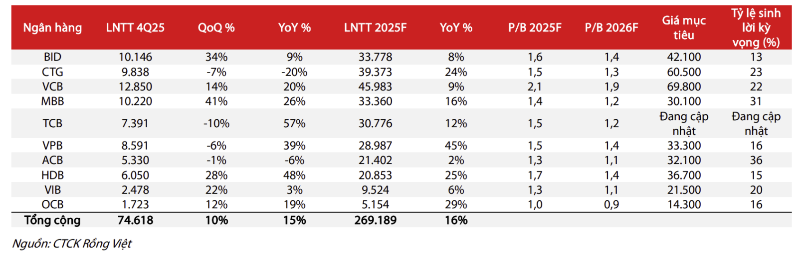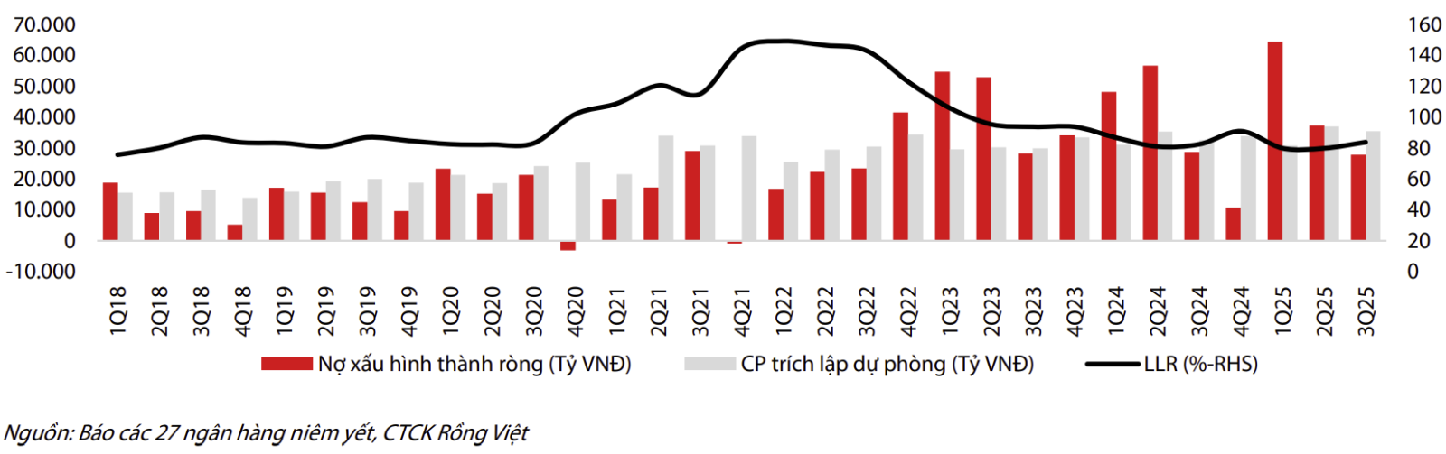 Bối cảnh pháp lý liên quan đến các dự án bất động sản và năng lượng tái tạo đã được tháo gỡ một phần trong năm 2025, cùng với tăng trưởng kinh tế cải thiện, được đánh giá là các yếu tố hỗ trợ chất lượng tín dụng. VDSC dự báo nợ xấu hình thành ròng quý IV/2025 sẽ tiếp tục giảm so với quý III, kéo tỷ lệ nợ xấu toàn danh mục xuống còn 1,8-1,9%, thấp hơn 10–20 điểm cơ bản so với cuối quý trước.
