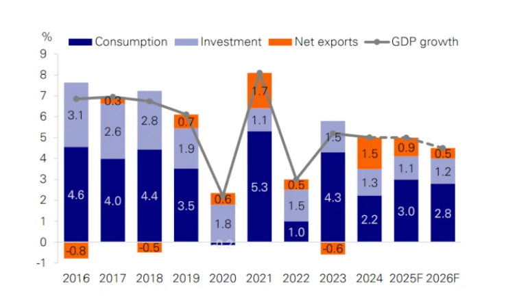Năm 2026, tăng trưởng dự kiến giảm còn 4,5% do ba nguyên nhân chính: thị trường bất động sản tiếp tục suy yếu, chính phủ đẩy mạnh tái cơ cấu các ngành dư thừa công suất, và đóng góp từ xuất khẩu ròng giảm.