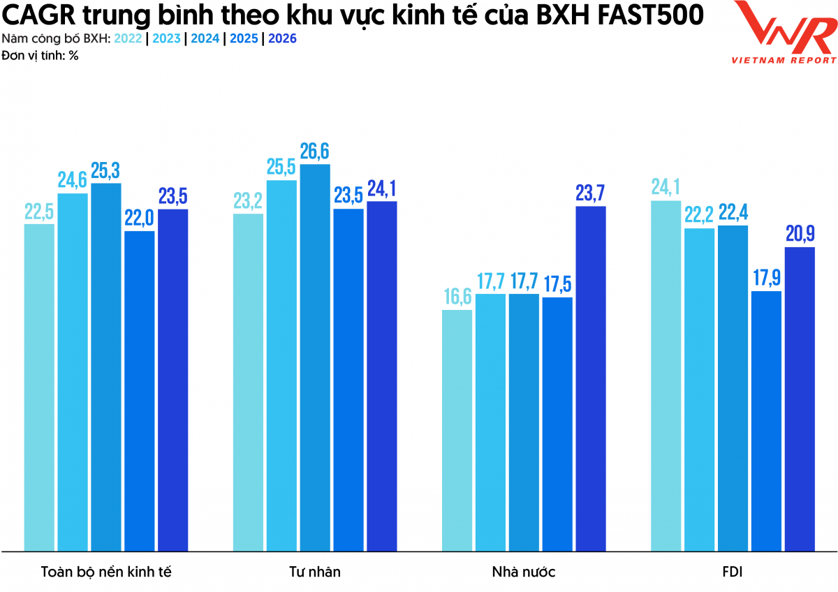 Thống kê của Vietnam Report cho thấy tốc độ tăng trưởng kép bình quân hàng năm về doanh thu trung bình của các doanh nghiệp FAST500 giai đoạn 2021-2024 ghi nhận dấu hiệu phục hồi nhẹ (23,5%), phản ánh tốc độ tăng trưởng dần ổn định trở lại sau khi chịu nhiều sức ép từ biến động kinh tế và suy giảm nhu cầu thị trường. Trong đó, khu vực tư nhân tiếp tục giữ vai trò dẫn dắt.