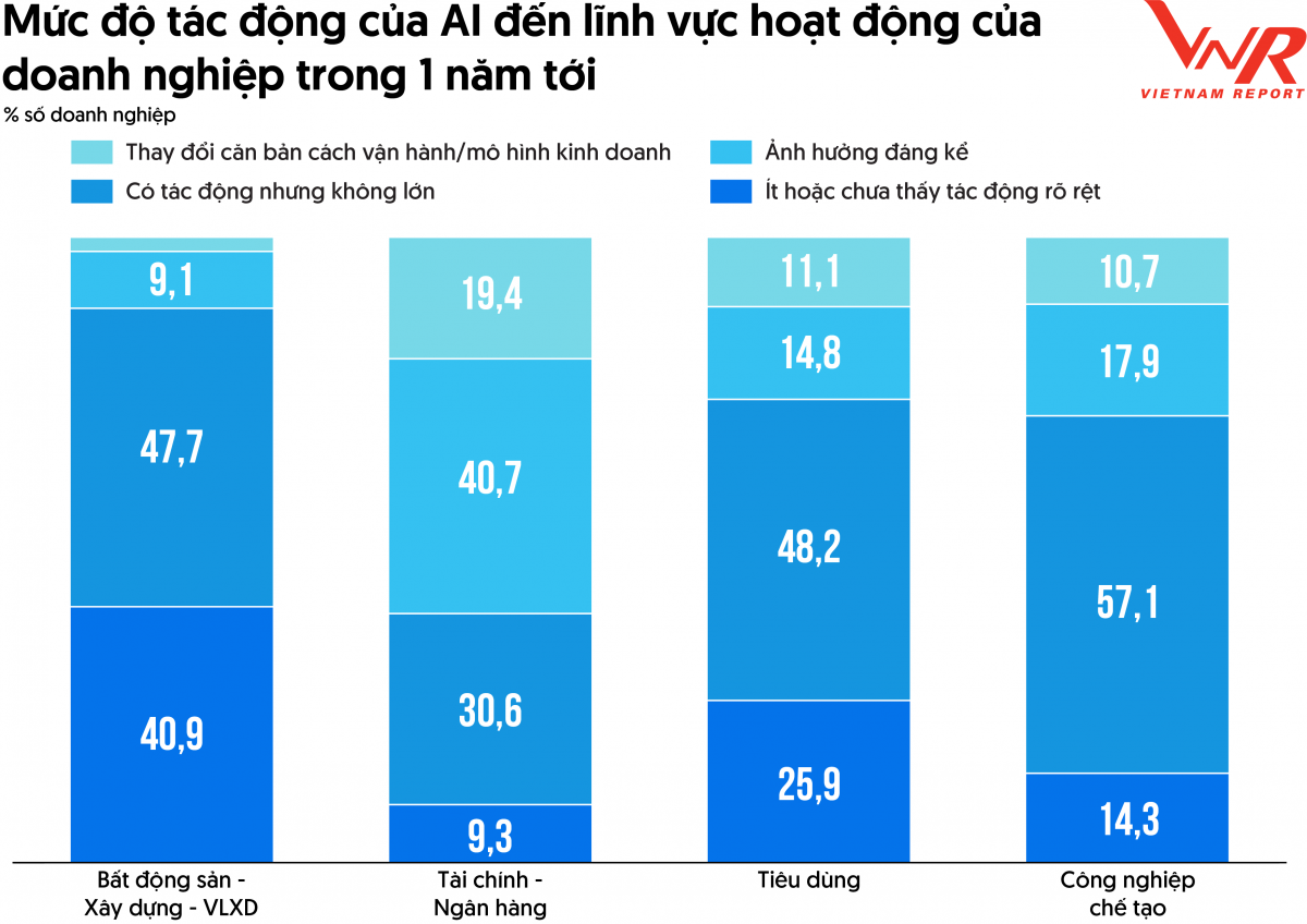 Tuy nhiên, mức độ tác động của AI không đồng đều giữa các ngành do đặc thù mô hình kinh doanh, mức độ số hóa và khả năng khai thác dữ liệu. Theo đó, trong năm tới, Tài chính - Ngân hàng được xem là lĩnh vực chịu ảnh hưởng mạnh mẽ bởi AI, trong khi lĩnh vực Công nghiệp chế tạo - Tiêu dùng chưa có tính đột phá và Bất động sản - Xây dựng - Vật liệu xây dựng chưa tạo ra tác động rõ rệt.