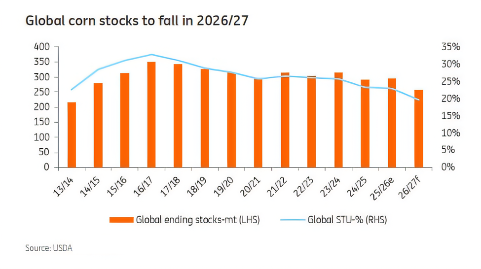 Chúng tôi tin rằng thị trường ngô sẽ chứng kiến sự thắt chặt đáng kể hơn trong niên vụ 2026/27, với mức thiếu hụt toàn cầu khoảng 39 triệu tấn. Điều này sẽ khiến lượng tồn kho cuối kỳ toàn cầu vào mùa vụ tới giảm xuống dưới 260 triệu tấn, tương đương với tỷ lệ tồn kho/sử dụng là 20%. Điều này sẽ bắt đầu tạo ra một số động lực tăng giá ngô trong mùa vụ 2026/27.