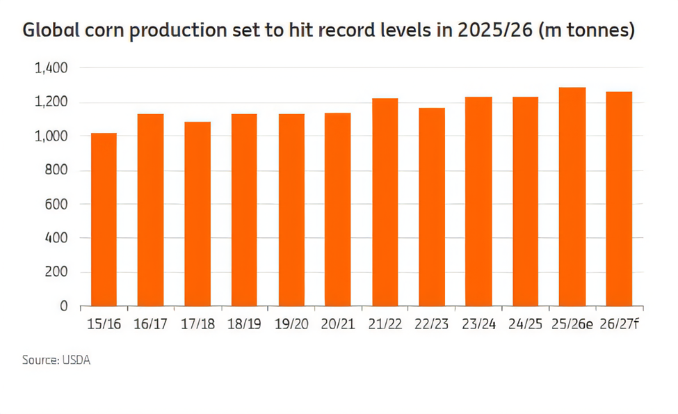 Sự tăng trưởng nguồn cung của Mỹ trong mùa vụ này có nghĩa là cán cân cung cầu toàn cầu cũng sẽ trở nên tương đối ổn định hơn trong năm 2025/26. Sản lượng ngô toàn cầu dự kiến sẽ đạt mức kỷ lục và bất chấp sự tăng trưởng tiêu thụ mạnh mẽ, được hỗ trợ bởi giá cả giảm, chúng tôi vẫn dự đoán lượng tồn kho cuối kỳ cho mùa vụ 2025/26 sẽ tăng hơn 4 triệu tấn so với năm trước, lên gần 296 triệu tấn, điều này sẽ giữ tỷ lệ tồn kho/sử dụng ổn định ở mức khoảng 23%. Cân bằng toàn cầu cho thấy khả năng tăng giá ngô có thể bị hạn chế, ít nhất là cho đến khi chúng ta có thêm thông tin về triển vọng cho niên vụ 2026/27.