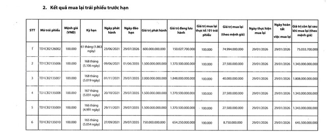 Cũng trong ngày này, doanh nghiệp còn mua lại tổng cộng 125 tỷ đồng 5 lô trái phiếu TD1CB2135006, TD1CB2135007, TD1CB2135008, TD1CB2135009 và TD1CB2135010.