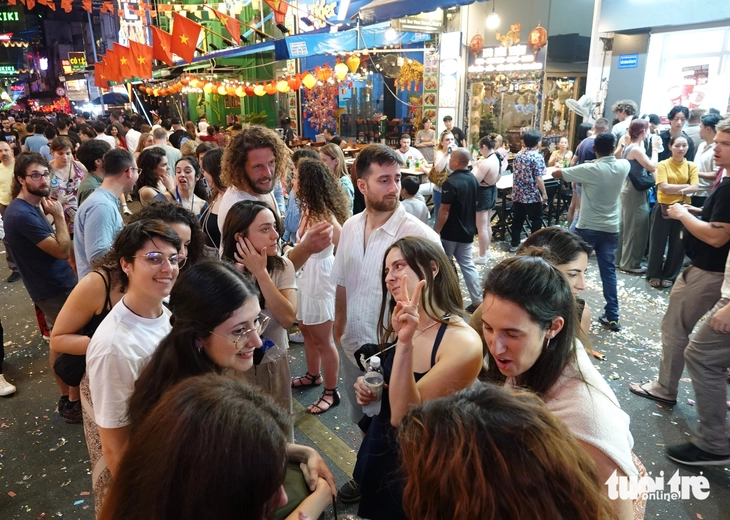 Nhóm bạn trẻ đến từ Úc và Philippines thưởng thức ẩm thực đường phố trong ngày đầu năm mới 1-1-2026 - Ảnh: T.T.D.