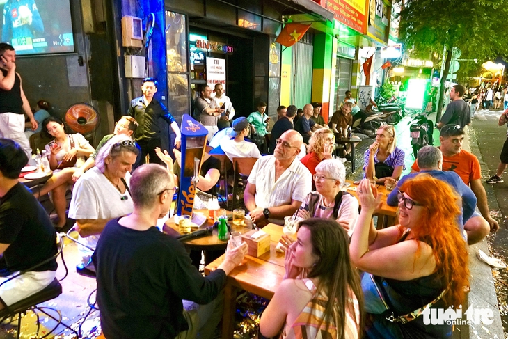 Nhóm khách ngồi uống bia đón năm mới tại quán nhạc trên đường Đề Thám, phường Bến Thành, TP.HCM trong dịp năm mới 2026 - Ảnh: T.T.D.