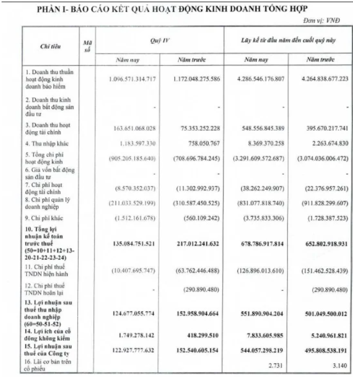 Báo cáo KQKD quý 4/2025 tại Bảo hiểm BIC.