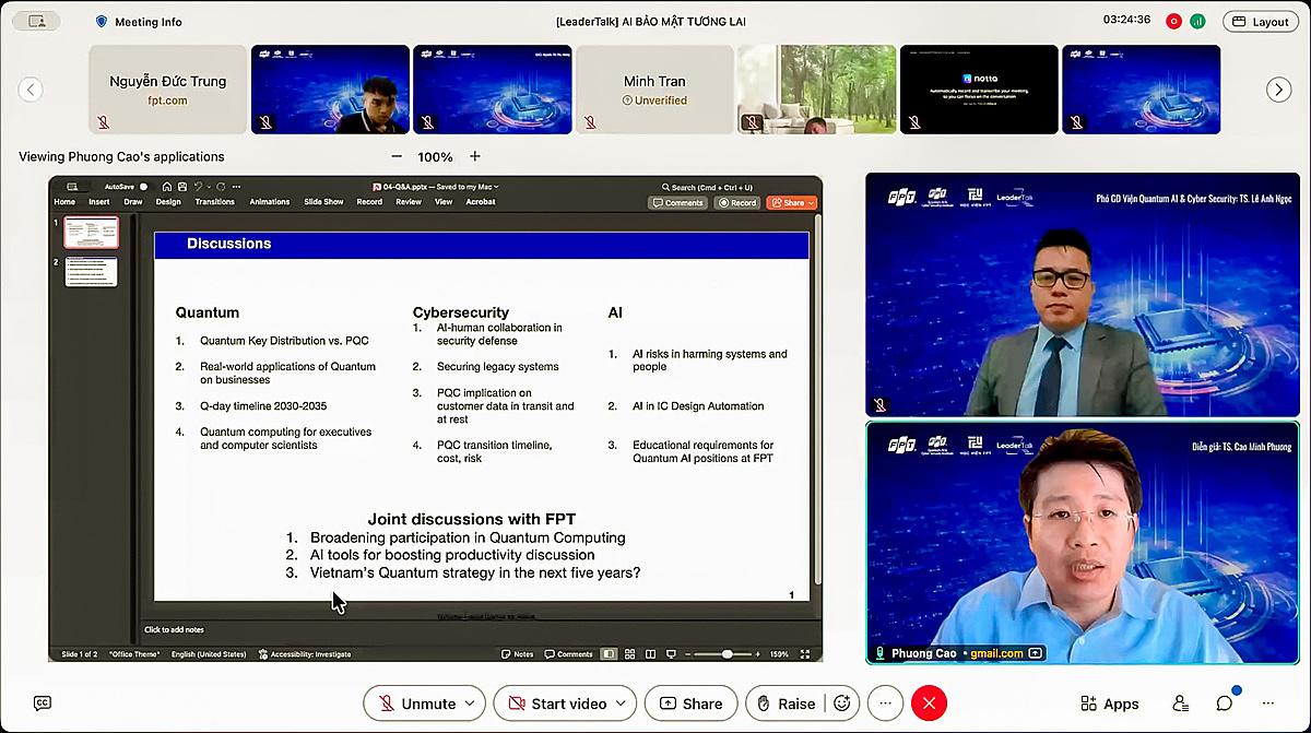 "FPT có thể chủ động triển khai đo đạc và nâng cấp chuẩn hậu lượng tử ngay trên hạ tầng sẵn có. Việc tiên phong làm chủ công nghệ này không chỉ củng cố tấm khiên bảo mật mà còn là minh chứng mạnh mẽ nhất để khẳng định vị thế dẫn dắt và làm chủ công nghệ của FPT trên thị trường”, TS. Cao Minh Phương gợi mở.