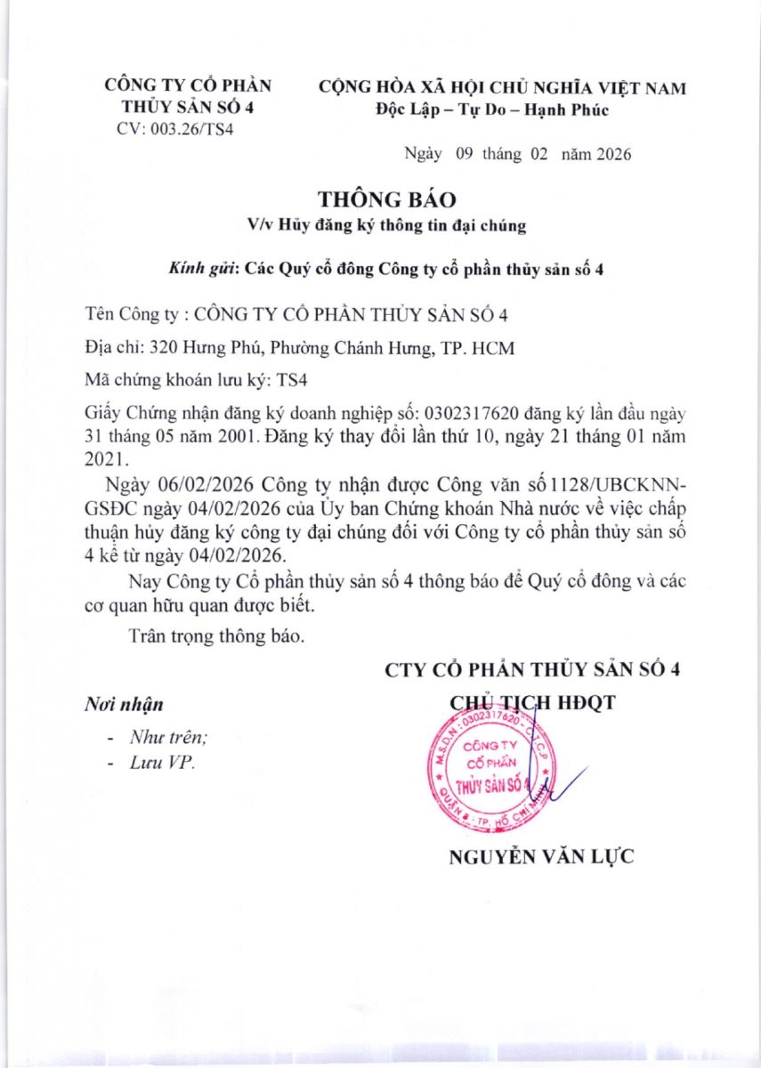 Ngày 06/02/2026, Công ty Cổ phần Thủy sản số 4 nhận được Công văn số 1128/UBCKNN-GSĐC của Ủy ban Chứng khoán Nhà nước về việc chấp thuận hủy đăng ký công ty đại chúng, có hiệu lực kể từ ngày 04/02/2026.