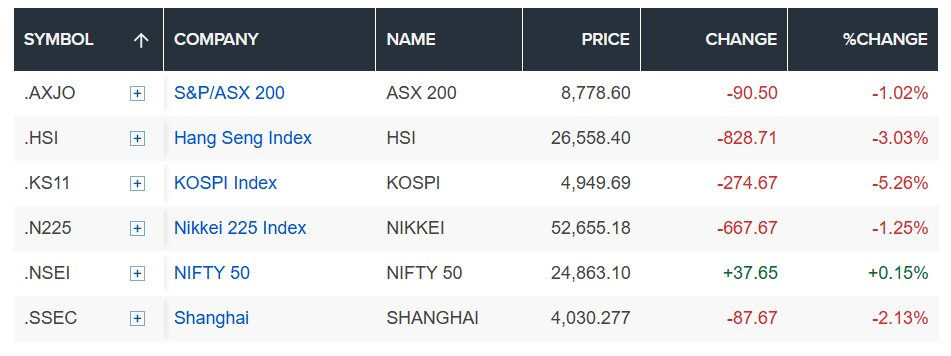 Theo Sở Giao dịch Chứng khoán Hàn Quốc, chỉ số KOSPI mở cửa ở mức 5.128,57 điểm, giảm 1,95% so với phiên trước. Đà giảm nới rộng trong phiên, khiến KOSPI rơi xuống dưới mốc 5.000 điểm vào khoảng 12h30. Đây là lần đầu tiên chỉ số này đánh mất ngưỡng 5.000 điểm trong vòng 5 phiên giao dịch, kể từ ngày 26 tháng trước.